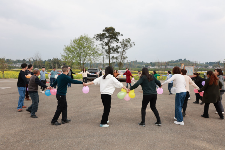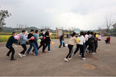 早晨8点,迎着春日的朝阳,伴着和煦的春风,满载的校车从学校出发,大家欢歌笑语,9点50分,大巴车到达景区停车场。按照既定路线安排,一行人沿着登山步道上山,一路伴着清风到达陈抟山景区观景台,远眺过去,映入眼帘的就是一副如诗如画油菜花的景象。花海的香气随着清风扑面而来,金黄的一片,与高大的陈抟雕塑相融合,勾勒出一道壮美的风景线。中午,大家品尝了当地的特色美食,有“太安鱼”、“双椒兔”等。小憩之后,组织开展了“正话反说”、“毛毛虫赛跑”、“狭路相逢”、“丢手绢”等项目的团建活动,通过一个个游戏互动,大家追忆了童年、增进了感情、放松了身心,整个活动都展现了我院教师良好的精神风貌。团建活动结束后,大家又一同乘坐了景区小火车,穿梭在油菜花田与粉色桃林中,近距离欣赏了花海的美景,感受了春天的气息与大自然的和谐。大家利用自由活动时间,三五成群、或驻足赏景、或拍照留念、或说笑逗乐,轻松惬意,其乐融融。