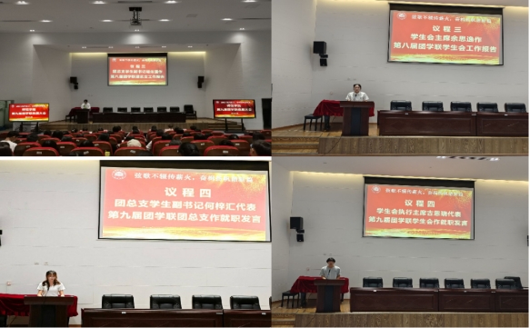 第八届团总支学生副书记胡佑潼、学生会主席余思逸分别在工作报告中总结了过去一年团总支、学生会的成绩和经验,强调团学联离不开同学们的支持,号召大家继续参与,共同努力更好地服务同学和学院发展。第九届团总支学生副书记何梓汇、学生会主席古恩瑞分别作就职演讲,满怀了对未来的憧憬,对岗位的认知,规划了工作思路,自信满满,神采飞扬,散发着青春的光芒。