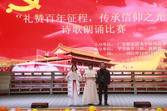 为庆祝建党100周年,弘扬传承爱国精神,增强同学们民族自豪感和文化自信心,提高学生语言表达能力和朗诵水平,国产又粗又猛又爽又黄视频于12月14日晚在杏坛举办了以“礼赞百年征程,传承信仰之光”为主题的诗歌朗诵比赛。党总支书记龙治勇、党总支副书记李勇、学生管理科科长李智强,21级、18级小教全体学生及辅导员参加了本次比赛。