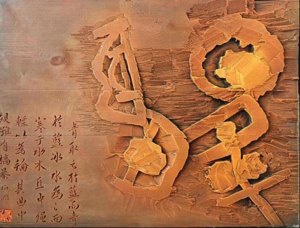 获奖作品取日月升恒意象,表达祖国繁荣昌盛、正当兴旺。作品以书法为主体,融传统刻字、篆刻、绘画、版画、雕塑等技艺于一体,采用“日”高“月”低、左浅右深布局,四周采用刀法撕裂呈现云彩光辉,展现出朝日初生、夜月犹存之景。右侧大字传达坚韧、果敢、坚实意境,左侧小字选自《劝学》,采用阴刻的方式进行展现,与大字的阳刻形成对比,使作品在刀刻上更加丰富。