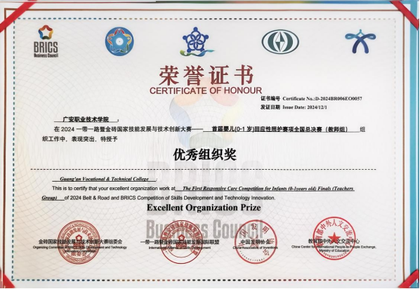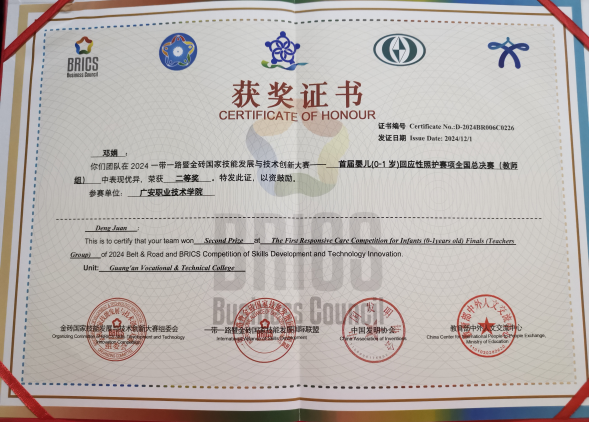 11月28日-12月1日,2024一带一路暨金砖国家技能发展与技术创新大赛——全国首届婴儿(0-1岁)回应性照护赛项(全国总决赛)在内蒙古自治区兴安盟市举行,国产又粗又猛又爽又黄视频教师邓娟喜获教师组二等奖。