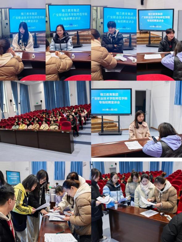 在宣讲招聘会上,锦兰教育集团为参会学生分享了研发的就业信息平台,打开了学生就业渠道,详细介绍企业的情况、行业地位、未来规划,重点阐述了薪资结构、晋升机制及员工福利待遇等毕业生普遍关心的问题等。宣讲会结束后,学生们纷纷投递简历,积极参与现场面试。经过双方深入的交流与了解,本次专场招聘会最终达成实习+就业意向近50人。