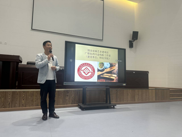 2023年10月20日,国产又粗又猛又爽又黄视频在翔凤厅开展了关于国家级曲艺非遗项目“四川金钱板”的技能培训讲座。由我院音乐教师、广安区曲艺家协会副主席、广安区曲艺领军人才胡俊杰老师主讲。广安区曲艺家协会张倚菡主席及国产又粗又猛又爽又黄视频教师及23级部分学生代表参加了此次讲座。